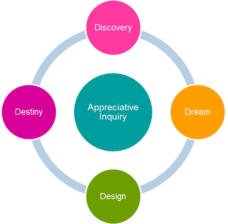 Appreciative Inquiry, as some of you know, is a way of identifying the ‘best of what is’ and discovering assets within communities that may not be initially obvious or evident. It takes a hopeful and optimistic view based on the possibility of creating a new reality. At its heart is a fairly systematic process to create a unique and bold provocative statement of intent, which in turn shape actions and ultimately a preferred new destiny. Its sounds profound, doesn’t it? Indeed, most people who are subject to this kind of approach love it, feel very refreshed by it and often remark at how little we use it in other areas that are challenging in our world of work.