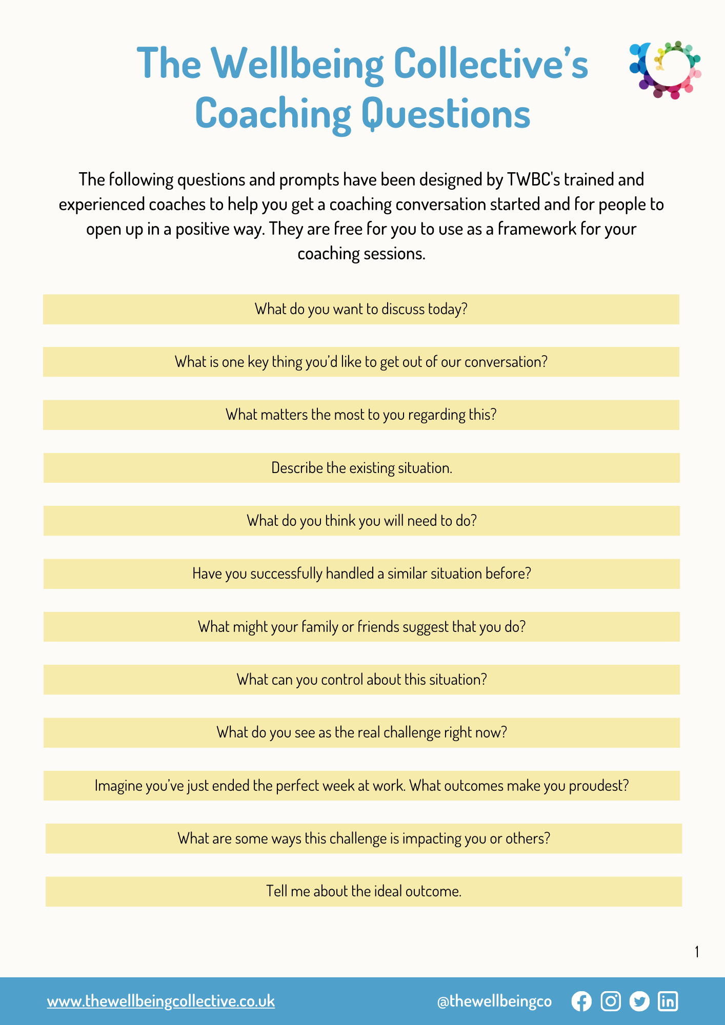 The following questions and prompts have been designed by TWBC’s trained and experienced coaches to help you get a coaching conversation started and for people to open up in a positive way. They are free for you to use as a framework for your coaching sessions.